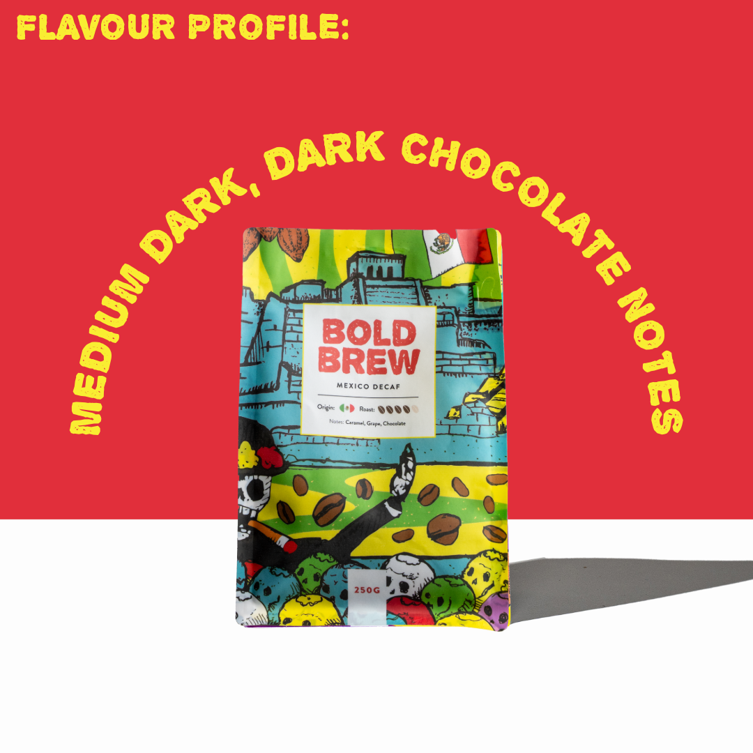 Mexico Decaf, sourced from smallholder producers in Chiapas, uses Mountain Water Processing, offering a chemical-free, medium-dark roast that boasts caramel, grape, and chocolate notes, all preserved by the process that retains the coffee's natural essence, ensuring outstanding flavors in every sip.